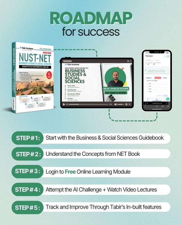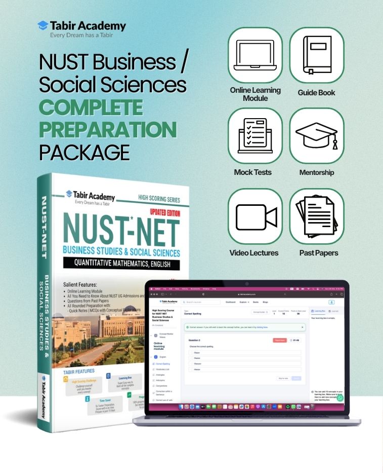 Prepare with confidence for the NUST NET Business Studies & Social Sciences exam with this all-in-one package. It combines a prep book, online course, practice MCQs, AI-powered FLPs, and mentorship support — giving you everything you need for structured and result-driven preparation.